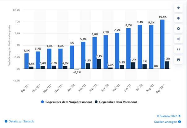 Siehe die monatliche Entwicklung der Inflation in Österreich von September 2021 bis September 2022: