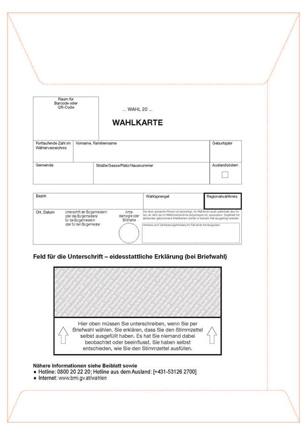 „(3) Die Wahlkarte ist als verschließbarer Briefumschlag herzustellen und hat die in der Anlage 3 ersichtlichen Aufdrucke aufzuweisen, darunter einen QR-Code, der einen bei einer Wahl sich nicht wiederholenden Zahlencode zu enthalten hat. Die Gemeinde hat das Wahlkarten-Formular vor oder bei Ausstellung der Wahlkarte mit der Anschrift der Gemeindewahlbehörde, in Statutarstädten der Bezirkswahlbehörde zu versehen. Wahlkarten, die mittels automationsunterstützter Datenverarbeitung ausgestellt werden, können anstelle der Unterschrift des Bürgermeisters mit einer Amtssignatur gemäß §§ 19 und 20 des Bundesgesetzes über Regelungen zur Erleichterung des elektronischen Verkehrs mit öffentlichen Stellen (E-Government-Gesetz – E-GovG), BGBl. I Nr. 10/2004, versehen werden, wobei § 19 Abs. 3 zweiter Satz E-GovG nicht anzuwenden ist. Die Wahlkarten-Formulare sowie die Wahlkarten-Schablonen (Abs. 4) sind den für die Ausstellung der Wahlkarten zuständigen Behörden aufgrund einer regelmäßig durchzuführenden Bedarfserhebung in ausreichendem Maß zur Verfügung zu stellen.