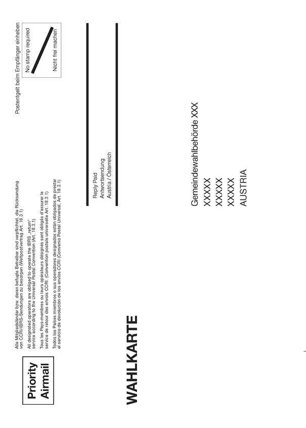 · Zur Briefwahl verwendete Wahlkarten werden durch die jeweils laut Wählerverzeichnis zuständige Sprengelwahlbehörde – in kleinen Gemeinden durch die Gemeindewahlbehörde – nach Schließung des jeweiligen Wahllokals, aber noch vor der allgemeinen Stimmauszählung, ausgewertet (ausgewertet = Wahlkarte auf Nichtigkeitsgründe geprüft, Wahlkuvert anonymisiert und der späteren Stimmauszählung zugeführt). Zu diesem Zweck gelangen bei der Ausstellung der Wahlkarten ausschließlich blaue, ungummierte Wahlkuverts zum Einsatz (diese werden durch eine örtliche Wahlbehörde nur in jenen Fällen gegen mit der Nummer des jeweiligen Landeswahlkreises versehene beige-farbene Kuverts ausgetauscht, bei denen eine Stimmabgabe am Wahltag, nicht vor der zuständigen örtlichen Wahlbehörde, erfolgt) (vgl. insb. Art. 1 Z 70, § 68 Abs. 1 NRWO).