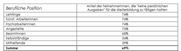 Für den Bereich der Selbstständigen gibt es eine Studie des Österreichischen Instituts für Wirtschaftsforschung und des Instituts für Höhere Studien im Auftrag der Kammer für Arbeiter und Angestellte für Wien aus dem Jahr 2007. Aus dieser Studie geht unter anderem hervor, dass rund 73% der Arbeitnehmer:innen die Ausgaben für die Weiterbildung nicht persönlich tragen, bei den Selbstständigen sind es hingegen nur 34%.[2]