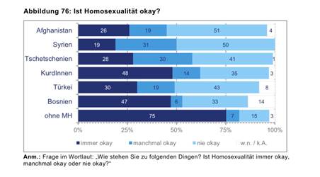 Der 2023 veröffentlichte Forschungsbericht des Österreichischen Integrationsfonds (ÖIF) bezüglich der Werte und Einstellungen junger Migrant:innen belegt, dass sich etwa ein Drittel der Jugendlichen mit Migrationshintergrund als "sehr religiös" oder "religiös" bezeichnen - 36% der jungen Männer und 28% der jungen Frauen (2). Eine Studie von Kenan Güngör aus 2019 fragte die Ablehnung von Homosexualität unter Jugendlichen aus verschiedenen Herkunftsländern ab. Während 75% der jungen Österreicher:innen ohne Migrationshintergrund Homosexualität "immer okay" finden, liegt die Zustimmung zu dieser Aussage bei Jugendlichen mit Migrationshintergrund aus primär muslimischen Ländern weit niedriger. Jugendliche mit einem afghanischen oder syrischen Migrationshintergrund stehen Homosexualität besonders ablehnend gegenüber - die Hälfte findet Homosexualität "nie okay". Genau so sehen das mehr als 40% der der Jugendlichen mit türkischen oder tschetschenischen Wurzeln (3). Auch eine Studie zu Parallelgesellschaften aus dem Jahr 2023 stellte fest, dass Intoleranz gegenüber Homosexualität bei bestimmten Gruppen, wie türkischen und syrischen Jugendlichen, besonders hoch ist (4).