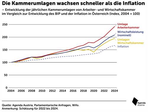Die Wirtschaftskammern haben wegen der Konstruktion des Umlagesystems besonders von der Krise und der hohen Inflation profitiert - die Einnahmen sprudeln (4). Ein näherer Blick auf die Berechnungsgrundlage zeigt deutlich, dass jede Branche von höheren Zahlungen betroffen war. Wenn die Aufwendungen für eingekaufte Lieferungen oder andere Leistungen durch die hohen Energiekosten steigen, erhöht sich also die Kammerumlage 1 und damit auch die Einnahmen der Wirtschaftskammern. Immer höhere Beitragszahlungen drohen ebenfalls über die Kammerumlage 2, was mitarbeiterintensive Branchen besonders belasten wird. Die durch die hohen Energiepreise gestiegene Inflation wird über die KV-Abschlüsse letztlich die Lohnkosten erhöhen, weshalb auch die Kammerumlage 2 zusätzliches Geld in die prallen Kassen der Wirtschaftskammern spülen wird. Berechnungen der Agenda Austria zeigen auf, dass die Kammerumlagen sogar schneller wachsen als die Inflation.