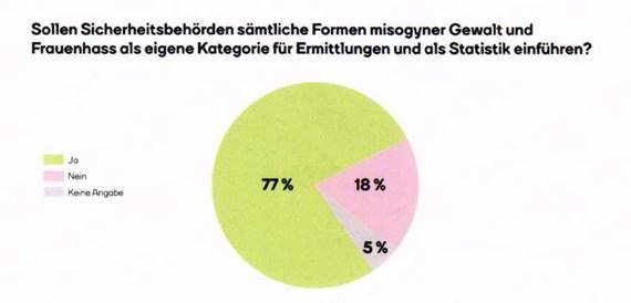 Konkret lautete die Frage: „Sollen Sicherheitsbehörden sämtliche Formen misogyner Gewalt und Frauenhass als eigene Kategorie für Ermittlungen und als Statistik einführen?“ 77% der Nationalrätinnen beantworteten diese Frage mit „Ja“.