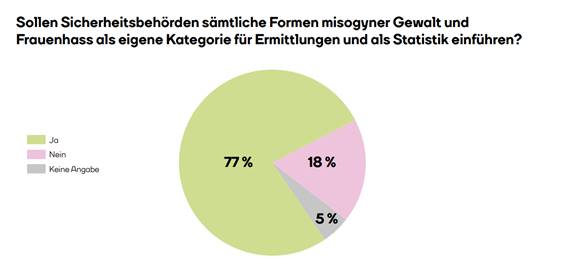 Konkret lautete die Frage: „Sollen Sicherheitsbehörden sämtliche Formen misogyner Gewalt und Frauenhass als eigene Kategorie für Ermittlungen und als Statistik einführen?“ 77 Prozent der Nationalrätinnen beantworteten diese Frage mit „Ja“.