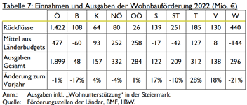Die nachfolgende Tabelle aus der Publikation "Wohnbauförderung in Österreich 2022" des Instituts für Immobilien, Bauen und Wohnen GmbH zeigt die Ausgaben für Wohnbauförderungen. Aus den Länderbudgets kamen davon lediglich insgesamt 477 Millionen Euro. Allein im Jahr 2022 betrug das Aufkommen aus den Wohnbauförderungsbeiträgen aber insgesamt ca. 1,30 Mrd. Euro. Somit wurden nur ca. 37 % dieser Beiträge tatsächlich für den Wohnbau verwendet.