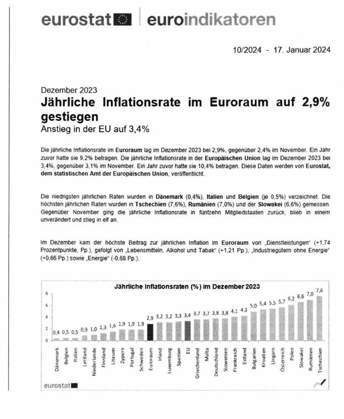 Die aktuelle Statistik von Eurostat (siehe Beilage) macht das völlige wirtschaftspolitische Versagen der Bundesregierung deutlich: Im Dezember 2023 lag die durchschnittliche Inflationsrate im Euroraum bei 2,9 %, die Inflation in Österreich betrug mit 5,7 % nahezu das Doppelte.