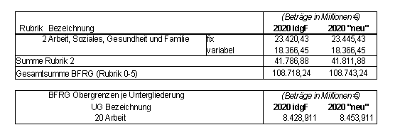 1. Im § 1 lautet die fixe Obergrenze für Auszahlungen der Rubrik 2 für das Jahr 2020 „23.445,431“; die Summe 2 lautet „41.811,881“; die Gesamtsumme aller Rubriken lautet „108.743,24“.