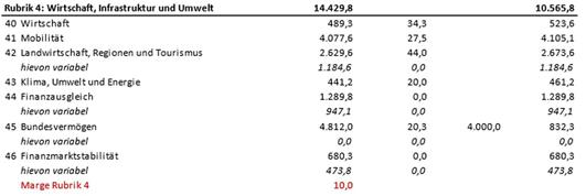 Geld macht nur dann einen Sinn, wenn es eingesetzt wird, daher durch Verwendung einen unmittelbaren Nutzen für Menschen ergibt – Geld am Sparbuch des Finanzministers ist sinnlos. In der Rubrik 4 sind in den Untergliederungen 40-46 lt. Budgetbericht immer noch insgesamt 10,5 Mrd. € Rücklagen vorhanden (s. Ausschnitt aus Tabelle 10, Budgetbericht BFG 2020, S. 98).