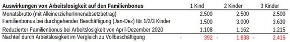 Kurzarbeit: Anhand eines konkreten (anonymisierten) Beispielfalles wird offensichtlich, wie ungerecht dieser Familienbonus der Regierung im Falle von Kurzarbeit ist. Eine alleinerziehende Mutter mit drei Kindern musste bedingt durch die COVID-Krise in Kurzarbeit gehen. Schon bisher konnte sie den vollen Familienbonus für drei Kinder von 1.500 € x 3 (4.500) nicht nutzen, da die Lohnsteuerzahlungen von Ihrem 2.480 € Monatsbruttogehalt niedriger war. Aber immerhin waren es 305,77 € monatlich Familienbonus. Mit der Kurzarbeit reduzierte sich ihre Lohnsteuerzahlung, die monatliche Familienbonusgutschrift sinkt auf 276,60 € und auch die Auszahlungsbeträge für die Monate April-Juni 2020 müssen reduziert werden.