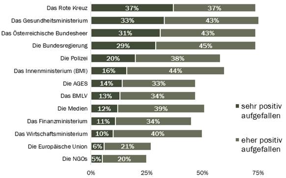 Rund drei Viertel (74%) der Befragten geben weiters an, dass ihnen das ÖBH in Bezug auf die Corona-Krise sehr- oder eher positiv aufgefallen sei. Im Vergleich zu anderen Organisationen rangiert das ÖBH damit hinter dem Roten Kreuz und dem Gesundheitsministerium auf Platz 3.