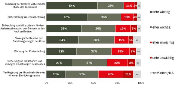 Hinsichtlich der konkreten Aufgaben des ÖBH im Rahmen der Covid-Krisenbewältigung werden sämtliche abgefragte Aufgaben mehrheitlich als (sehr oder eher) wichtig beurteilt. Insbesondere die Sicherung der Grenzen während der Phase des „Lockdowns“, die mehrheitlich (54%) als „sehr wichtig“ gesehen wird, trifft auf hohe Akzeptanz. Rund vier von zehn Befragten betrachten zudem die Sicherstellung der Warenauslieferung (43%) und die Einberufung von Milizsoldaten (37%) als sehr wichtig.
