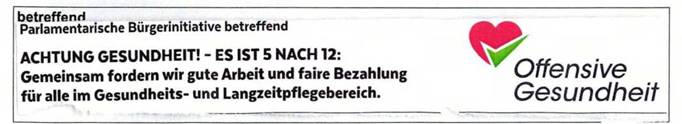 Der Nationalrat wird ersucht, umgehend Maßnahmen zu beschließen, um die akute Krise im Gesundheitswesen und der Langzeitpflege endlich zu beenden. Es ist 5 nach 12. Leere Betten in Krankenhäusern und Pflegeheimen sowie überlange Wartezeiten auf Leistungen mobiler Pflege- und Betreuung zeigen die Versorgungskrise aufgrund der akuten Personalnot auf.