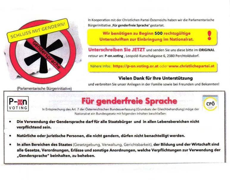 in Entsprechung des Art. 7 der Österreichischen Bundesverfassung (Grundsatz der Gleichbehandlung) ein Bundesgesetz mit folgenden Inhalten zu beschließen: - Die Verwendung der Gendersprache darf für alle Staatsbürger und in allen Lebensbereichen nicht verpflichtend sein. - Natürliche oder juristische Personen, die nicht gendern, dürfen nicht benachteiligt werden. - In allen Bereichen des Staates (Gesetzgebung, Verwaltung, Gerichtsbarkeit), der Bildung und der Wirtschaft sind alle Gesetze, Verordnungen, Erlässe und sonstige Anordnungen, welche Verpflichtungen zur Verwendung der „Gendersprache" beinhalten, zu beheben.