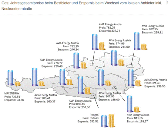 Ein weiterer Aspekt ist die jetzt bereits bestehende Unübersichtlichkeit der Energiepreise bei den einzelnen Anbietern, wobei der Aspekt der Preise mit und ohne Neukundenrabat die Unübersichtlichkeit noch verstärkt. Als Beispiel sei nur die Vielfalt und die preislichen Unterschiede bei Gasenergieanbieter angeführt, wobei die Grafik nicht taxativ ist:
