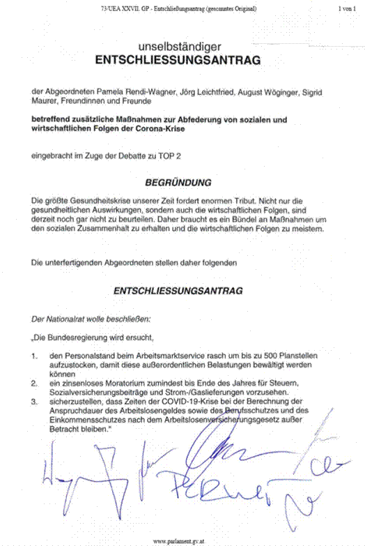 „Der vorliegende Gesetzesantrag dient der Umsetzung des Punktes 3 des im Zuge der 22. Sitzung des Nationalrates vom 3. April 2020 von ÖVP, SPÖ und Grünen beschlossenen Entschließungsantrages 73/UEA