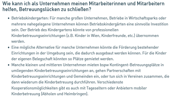 Die Statistiken sagen leider nicht viel über die Nähe der Kinderbetreuungseinrichtungen zu den jeweiligen Arbeitsplätzen an, womit ein wesentliches Kriterium der Realitätsnähe fehlt. Betriebskindergärten sind aufgrund der raschen Möglichkeit der Einbindung von Eltern in schwierigen Betreuungssituation von Bedeutung. Das hat auch die Wirtschaftskammer Österreichs erkannt, die für ihre Mitglieder folgende Tipps zur Umsetzung eines derartigen Angebots gibt: