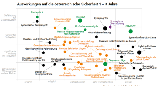 Die Sicherheitspolitische Jahresvorschau 2021 (2022 existiert anscheinend noch nicht) besagt: ‚Zu Beginn des Jahres 2021 ist eine qualitative Veränderung in der Beurteilung der Risikolage Österreichs festzustellen. Die Sicherheitslage Österreichs ist nicht mehr bloß von einer allgemeinen und eher abstrakten Verschlechterung der Lage gekennzeichnet, vielmehr sind mehrere der bislang nur prognostizierten Szenarien nunmehr auch tatsächlich eingetreten. (…)