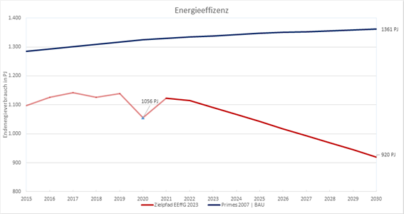 Die nachfolgende Grafik zeigt die notwendigen Einsparungen gemäß der Richtlinie 2018/2002/EU im Vergleich zu einem „Business as Usual“-Szenario („BAU“ bzw. Primes 2007)