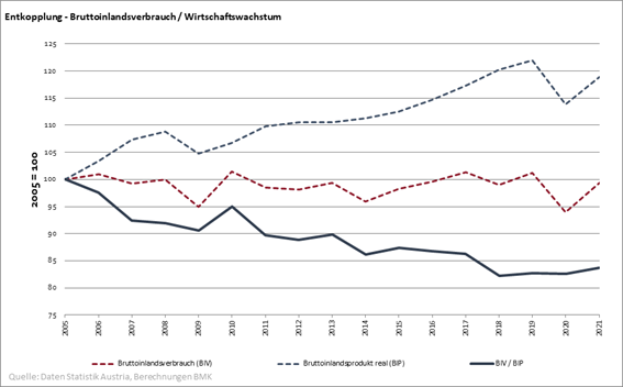 Die nachfolgende Grafik zeigt die Entwicklung der Gesamtenergieintensität und des Energieverbrauchs je BIP in Österreich seit dem Jahr 2005 bis 2021 auf: