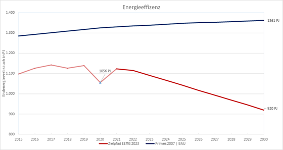 Das kumulierte Endenergieeffizienzziel von 310 PJ gemäß § 4 Abs. 1 Z 3 EEffG wurde mit dem Kalenderjahr 2019 erreicht. Der Zielwert bezogen auf ein Regeljahr im Kalenderjahr 2020 liegt nach endgültigen Daten der Energiebilanz bei gerundet 1.053 Petajoule. Der Energieeffizienzrichtwert gemäß § 4 Abs. 1 Z 1 EEffG wurde mit 1.050 Petajoule festgelegt. Obwohl das Ziel des EEffG mit 3 Petajoule nur knapp verfehlt wurde, ist der gegenwärtige Pfad jedenfalls nicht kompatibel mit aktuellen europäischen und nationalen Klimaschutzzielen. Im Jahr 2020 ist aufgrund der COVID-Krise ein deutlicher Einbruch des Energieverbrauchs zu verzeichnen und bei gleichbleibender wirtschaftlicher Entwicklung wie in den Vorjahren hätte der Endenergieverbrauch rund 1.140 PJ im Jahr 2020 betragen. Der Energieverbrauch ist in Österreich in längerfristiger Betrachtung durch stetige Zuwächse gekennzeichnet; erst in der jüngeren Vergangenheit seit 2005 konnte eine weitgehende Stagnation festgestellt werden.