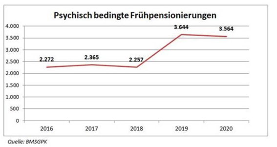 „Die Anfragebeantwortung zu psychisch bedingten Frühpensionierungen (8060/AB XXVII. GP (1)) hat ergeben, dass der Anteil der psychischen Leiden bei den Gründen für Frühpensionierungen stark zunimmt. So erfolgten 2020 knapp 3.600 Frühpensionierungen aus psychischen Gründen (exkl. Beamtenpensionssystem). Insgesamt weist die Pensionsstatistik der PVA bereits knapp 55.000 psychisch bedingte Pensionierungen aus (2).