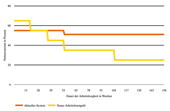 Eine effizienzsteigerndere Umgestaltung von Leistungen in der Arbeitslosenversicherung in Bezug auf die Höhe der Nettoersatzraten kann aufkommensneutral gestaltet werden: Am Beginn der Arbeitslosigkeit können die Nettoersatzraten höher sein als bisher, um dann im zeitlichen Verlauf zu sinken - auch unter das derzeitige Niveau. Außerdem ist der Leistungsbezug zeitlich zu begrenzen (Siehe Grafik 2).