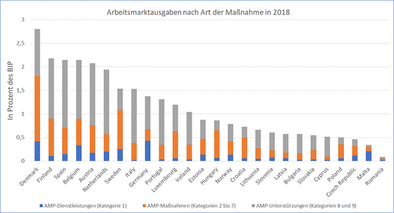 Betrachtet man jedoch die Ausgaben für arbeitsmarktpolitische Maßnahmen im Verhältnis zum BIP nach Art der Maßnahme im europäischen Vergleich, zeigt sich für Österreich ein interessantes Bild (siehe Grafik 1). Österreich gehört zu jenen Ländern, die gemessen am BIP am meisten für arbeitsmarktpolitische Maßnahmen ausgeben. Dies ist den hohen Ausgaben für passive Leistungen geschuldet, die bei fast 63 Prozent der Gesamtausgaben für arbeitsmarktpolitische Maßnahmen liegen. 28 Prozent der Gesamtausgaben für arbeitsmarktpolitische Maßnahmen fallen auf aktivierende Maßnahmen aus. Vorzeigeländer, wie Dänemark, mit einer geringeren Langzeitarbeitslosigkeit und mit flexibleren passiven Leistungen zeigen im Vergleich zu Österreich eine geringere Ausgabenquote für passive Leistungen (35 Prozent der Gesamtausgaben für arbeitsmarktpolitische Maßnahmen).