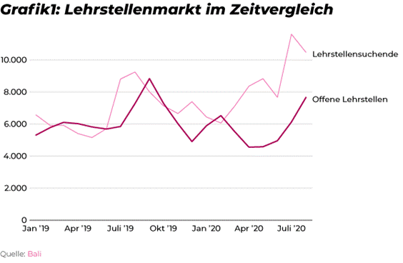 „Die Covid-bedingten Folgen der Wirtschaftskrise resultieren in einer immens hohen Jugendarbeitslosigkeit. Im Vergleich zum Vorjahr stieg die Jugendarbeitslosigkeit um 35,7 Prozent (Stichtag 1. September) an. Längerfristige Arbeitslosigkeitserfahrungen können bei Jugendlichen Narben (sogenannte scarring effects) hinterlassen, die im späteren Leben noch zu einer geringeren Lebens- und Arbeitszufriedenheit, zu einem schlechteren Gesundheitszustand, geringeren Einkommenschancen und zu einem erhöhten Arbeitslosigkeitsrisiko führen. Neben einer hohen Jugendarbeitslosigkeit sind die offenen Lehrstellen im Vergleich zum Vorjahr um 19,4 Prozent gesunken, was die Situation noch weiter verschlimmert. Dieser Zustand wird in Grafik 1 dargestellt. Mit Stichtag 1. September kommen auf 10.483 Lehrstellensuchende 7.661 Lehrstellen, somit fehlen fast 30 Prozent der Lehrstellen.