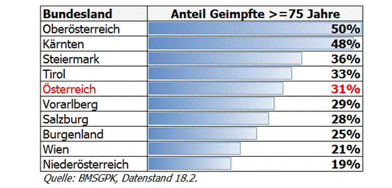 „ Vor kurzem wurden die Covid-Impfungen je Altersgruppe online gestellt (1). Dabei fällt sofort auf, dass der Anteil der geimpften über 75-jährigen zwischen den Bundesländern stark variiert. Während Oberösterreich einen Anteil von 50 Prozent ausweist, liegt der entsprechende Wert in NÖ lediglich bei 19 Prozent. Das ist bemerkenswert und höchst unerfreulich, da im Impfplan Personen in Alters-/Pflegeheimen und Personen über 80 Jahren priorisiert werden (2). Diesbezüglich wird leider erneut offensichtlich, dass der Gesundheitsminister seine Aufsichtsfunktion nicht wahrnimmt und chaotische Impf-"Strategien" in den Bundesländern zulässt. Gerade in Zeiten der knappen Impfstoffressourcen ist aber ein starke Leitung und Koordination durch den Gesundheitsminister und die strikte Einhaltung des Impfplanes zugunsten der Risikogruppen entscheidend.