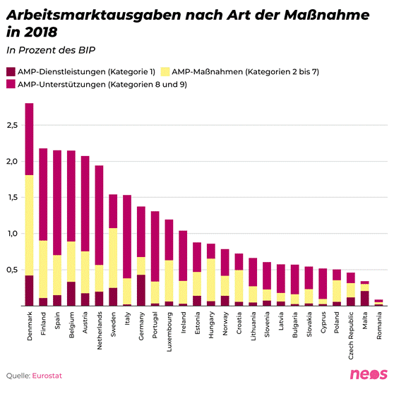 Betrachtet man jedoch die Ausgaben für arbeitsmarktpolitische Maßnahmen im Verhältnis zum BIP nach Art der Maßnahme im europäischen Vergleich, zeigt sich für Österreich ein interessantes Bild. Österreich gehört zu jenen Ländern, die gemessen am BIP am meisten für arbeitsmarktpolitische Maßnahmen ausgeben. Dies ist den hohen Ausgaben für passive Leistungen geschuldet, die bei fast 63 Prozent der Gesamtausgaben für arbeitsmarktpolitische Maßnahmen liegen. 28 Prozent der Gesamtausgaben für arbeitsmarktpolitische Maßnahmen werden für aktivierende Maßnahmen ausgegeben. Vorzeigeländer, wie Dänemark, mit einer geringeren Langzeitarbeitslosigkeit und mit flexibleren passiven Leistungen, zeigen im Vergleich zu Österreich eine geringere Ausgabenquote für passive Leistungen (35 Prozent der Gesamtausgaben für arbeitsmarktpolitische Maßnahmen).