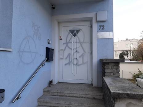 Dieses Mal wurde der Eingangsbereich nicht mit Ausscheidungen attackiert, sondern "nur" beschmiert. Die Tür und der Bereich des Stiegenaufgangs wurde mit einem großen A, welches umkreist ist, versehen.