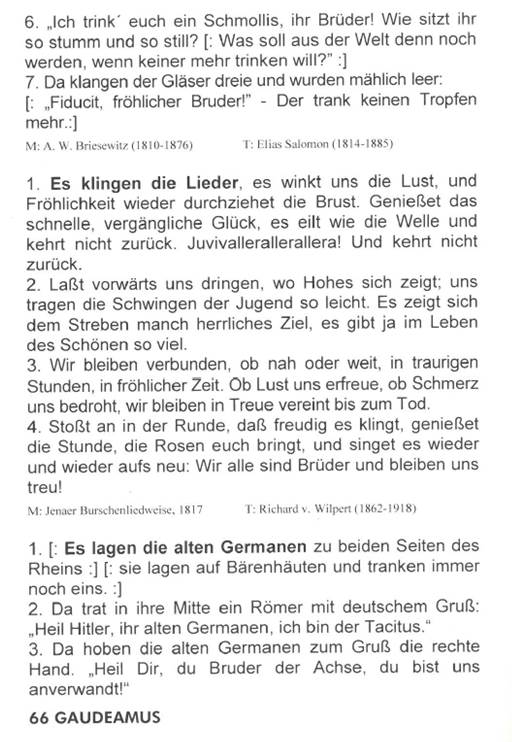 Das Österreichische Kommersbuch des ÖCV, Liederbuch der katholischen Couleurstudenten, herausgegeben vom Mittelschüler-Kartellverband (MKV) im Namen des Österreichischen Cartellverbandes (ÖCV), dem zahlreiche Politiker angehören (auch Nationalratspräsident Mag. Wolfgang Sobotka vulgo Hortulanus), enthält genauso das Lied „Es liegen die alten Germanen“ mit der „Heil Hitler“-Passage (S. 346):