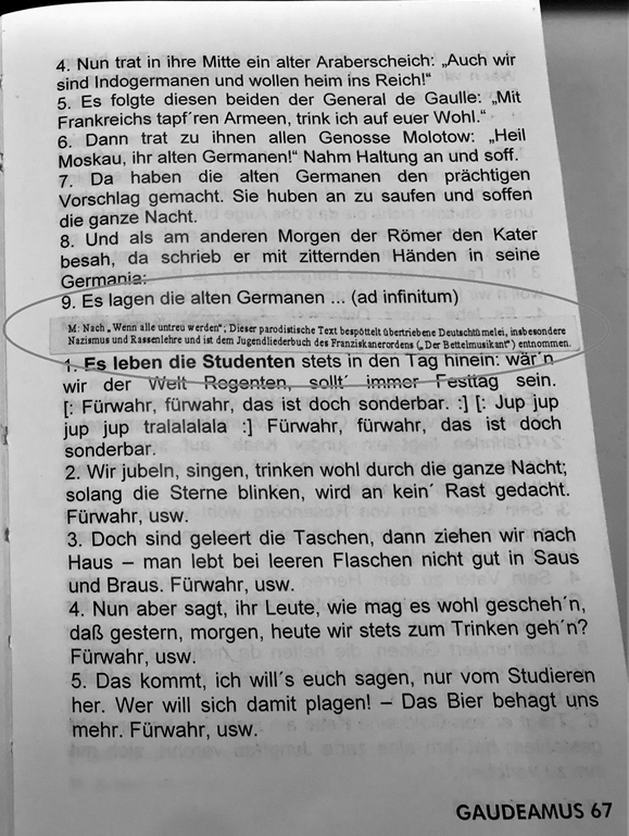 Der Kartellverband beteuere, dass die Drucklegung mit einem erklärenden Textzusatz erfolgte. Dies ist jedoch eindeutig falsch wie anhand einiger Belegexemplare des Liederbuchs klar zu erkennen ist. Denn der Druck erfolgte in der Version MIT der Heil-Hitler-Passage und OHNE einen Hinweis. Wie auf dem folgenden Foto ersichtlich, wurde der Hinweis offenbar zu einem späteren Zeitpunkt eingeklebt.