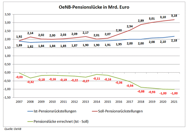 Da die Berechnungszins-Erwartungen der OeNB in den letzten Jahren aufgrund der Niedrigzinspolitik massiv zurückgegangen sind, sind auch die notwendigen Pensionsrückstellungen kräftig gestiegen. Mittlerweile betragen die erforderlichen OeNB-Pensionsverpflichtungen („Deckungserfordernis“) 3,18 Mrd. Euro, weshalb die OeNB mit dem Bilden der nötigen Pensionsrückstellungen schon lange nicht mehr Schritt hält. Zuletzt betrugen die tatsächlichen Rückstellungen („Pensionsreserve“) "nur" 2,18 Mrd. Euro, womit sich die rechnerische Lücke zwischen erforderlichen und tatsächlichen Pensionsrückstellungen auf 1 Mrd. Euro ausgeweitet hat. Den eigenen Berechnungen der OeNB zur Folge ist die Lücke zwar etwas geringer, beträgt aber mittlerweile bereits 509 Mio. Euro (S. 134, Geschäftsbericht 2021). Dazu die OeNB im Geschäftsbericht 2021 (Seite: 133): "Das zum 31. Dezember 2021 ermittelte versicherungsmathematische Deckungserfordernis beträgt 3.182.511 Tsd EUR und ist durch die Pensionsreserve und durch stille Reserven in Immobilien teilweise gedeckt." Sprich: NICHT gedeckt.