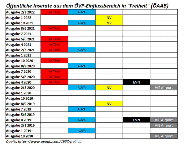 Stück für Stück kommt ans Licht, wie ÖVP und SPÖ mittels Inseraten oder Umgehungskonstruktionen öffentliches Geld an "befreundete" Medien oder Parteizeitungen weiterschleusen. Mittlerweile haben die alten Parteien diese Form indirekter Parteienfinanzierung in einem Ausmaß überspannt, dass der Rechnungshof nun vorhat, genauer nachzuprüfen (1). Erst kürzlich hat ein Inseratenskandal der tiefschwarzen Wirtschaftskammer Vorarlberg, deren Fachorganisationen außergewöhnlich viel in der Zeitung der ÖVP-Teilorganisation Wirtschaftsbund, der "Vorarlberger Wirtschaft", inseriert hatten, für Aufregung gesorgt (2). Aber es nimmt kein Ende. Denn bei einer Durchschau der ÖAAB-Zeitung "Freiheit" fallen sofort die regelmäßigen Inserate von öffentlichen Unternehmen im ÖVP-Einflussbereich ins Auge. Sämtliche unten angeführten Inserate (siehe Tabelle) wurden nicht in die RTR-Medientransparenz-Datenbank eingemeldet. Die letzten Inserate, die seitens der AUVA in "Freiheit" gemeldet wurden, stammen aus dem 3. Quartal 2013 mit EUR 13.500 (3).
