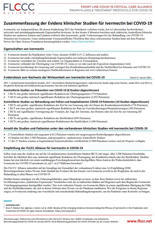 „Ivermectin, ein Antiparasitikum, für dessen Entdeckung 2015 der Nobelpreis verliehen wurde, hat in Laborstudien hochwirksame, antivirale und entzündungshemmende Eigenschaften bewiesen. In den letzten 4 Monaten berichten auch zahlreiche, kontrollierte klinische Studien aus mehreren Zentren und Ländern weltweit über konsistente, große Verbesserungen bei der Behandlung von COVID-19- Patienten mit Ivermectin. Unser umfassender wissenschaftlicher Überblick über diese referenzierten Studien kann auf dem Preprint-Server der Open Science Foundation heruntergeladen werden: https://osf.io/wx3zn/“, wird von FLCCC auf der Internetseite festgehalten.[3]