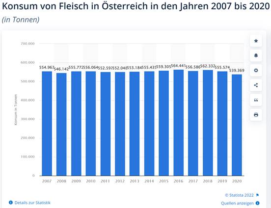 Die heimische Lebensmittelproduktion erfüllt sehr hohe Standards und bietet den Nutztieren auch gute Haltungsbedingungen. In Österreich werden rund 539.369 Tonnen Fleisch (Jahr 2020) verzehrt, das entspricht 60,5 kg pro Person.