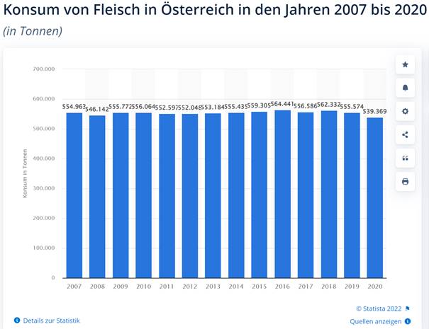 Die heimische Lebensmittelproduktion erfüllt sehr hohe Standards und bietet den Nutztieren auch gute Haltungsbedingungen. In Österreich werden rund 539.369 Tonnen Fleisch (Jahr 2020) verzehrt, das entspricht 60,5 kg pro Person.
