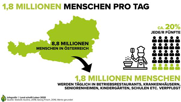 1,8 Millionen Menschen werden in Österreich täglich in Kantinen versorgt, davon rund 450.000 in öffentlichen Einrichtungen. Die Bundeskantinen haben einen Wareneinsatz von 1,35 Millionen Euro pro Tag und mehr als 330 Millionen Euro pro Jahr. Damit sind sie ein entscheidender Wirtschaftsfaktor und haben eine große Auswirkung auf den Absatz der heimischen Lebensmittel.