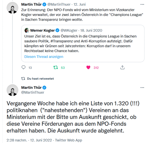 Zuletzt wollte auch der ORF-Journalist Martin Thür eine Auskunft über die Förderungen an Parteivereine durch den NPO-Fonds bekommen. Die Auskunft wurde jedoch vom Vizekanzleramt abgelehnt. Das passt aber nicht ganz mit dem ursprünglichen Vorhaben des Vizekanzlers zusammen: "Unser Ziel ist es, dass Österreich in die Champions League in Sachen saubere Politik, #Transparenz und Anti-Korruption aufsteigt." (18.6.2020, Werner Kogler, Twitter). Noch dazu hat der Journalist eine gut aufbereitete Excel-Liste mit den Parteivereinen mitgeschickt, wodurch der Beantwortung des Auskunftsbegehrens leicht nachgekommen hätte werden können.