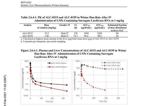 Frage 59 e.: Die Angaben zur Konzentration an ALC-0315 in der Leber der Versuchstiere im EMA Assessment Report Comirnaty (19.02.2021) passen nicht zu den Angaben im Pfizer Dokument BNT162b2 Module 2.6.4. Pharmacokinetics Written Summary2 – siehe auch oben im Text die Nr. 59 e. Wie lautet die Stellungnahme des Bundesministeriums zu diesem Sachverhalt?
