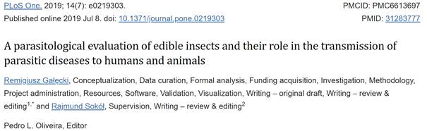 From 1 January 2018 came into force Regulation (EU) 2015/2238 of the European Parliament and of the Council of 25 November 2015, introducing the concept of “novel foods”, including insects and their parts. One of the most commonly used species of insects are: mealworms (Tenebrio molitor), house crickets (Acheta domesticus), cockroaches (Blattodea) and migratory locusts (Locusta migrans). In this context, the unfathomable issue is the role of edible insects in transmitting parasitic diseases that can cause significant losses in their breeding and may pose a threat to humans and animals. The aim of this study was to identify and evaluate the developmental forms of parasites colonizing edible insects in household farms and pet stores in Central Europe and to determine the potential risk of parasitic infections for humans and animals. The experimental material comprised samples of live insects (imagines) from 300 household farms and pet stores, including 75 mealworm farms, 75 house cricket farms, 75 Madagascar hissing cockroach farms and 75 migrating locust farms. Parasites were detected in 244 (81.33%) out of 300 (100%) examined insect farms. In 206 (68.67%) of the cases, the identified parasites were pathogenic for insects only; in 106 (35.33%) cases, parasites were potentially parasitic for animals; and in 91 (30.33%) cases, parasites were potentially pathogenic for humans. Edible insects are an underestimated reservoir of human and animal parasites. Our research indicates the important role of these insects in the epidemiology of parasites pathogenic to vertebrates. Conducted parasitological examination suggests that edible insects may be the most important parasite vector for domestic insectivorous animals. According to our studies the future research should focus on the need for constant monitoring of studied insect farms for pathogens, thus increasing food and feed safety”[3]