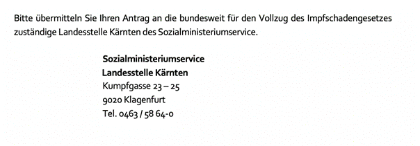 Wie genau die Abwicklung eines derartigen Antrags abläuft, ist allerdings unklar. Soweit das Ministerium selbst die Abwicklung erklärt, müssen Anträge bei der jeweiligen Landesstelle des Sozialministeriumsservice gestellt werden und sollten damit im jeweiligen Bundesland abgewickelt werden (3). In den Unterlagen zum Impfschadengesetz, die vom Sozialministeriumservice zur Verfügung gestellt werden, steht allerdings die Landesstelle Kärnten als bundesweit zuständige Stelle, was für Betroffene dementsprechend eine überraschende Information darstellt: