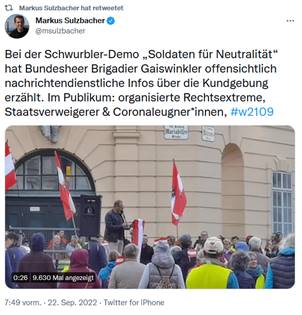 Am 21. September 2022 kam es am Platz der Menschenrechte zu einer Demonstration, die unter anderem von einer Gruppe angemeldet wurde, die sich als „Soldaten für Neutralität“ bezeichnen. Dabei anwesend waren auch Angehörige des Österreichischen Bundesheers (ÖBH), wie beispielsweise Brigadier Johann Gaiswinkler, der dort auch eine Rede gehalten hat.