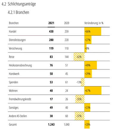 Im Jahr 2021 wurden an die Verbraucherschlichtung Austria insgesamt 8.527 Anfragen und somit rund 8 Prozent mehr als im Vorjahr herangetragen. Anfragen sind alle Kontaktaufnahmen außerhalb bzw. im Vorfeld eines Schlichtungsverfahrens. Außerdem wurden im Jahr 2021 insgesamt 1.243 Schlichtungsanträge gestellt und somit rund 20 Prozent mehr als im Jahr davor. Bei diesen Anträgen fielen einige Branchen besonders auf, wie nachstehende Grafik zeigt: