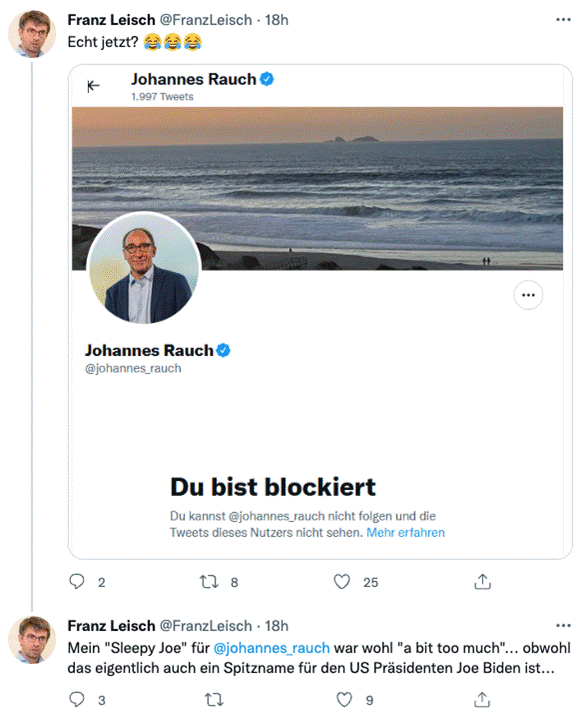 Das war für Rauch zu viel: Er blockierte Leisch. „Mein ‚Sleepy Joe‘ für Johannes Rauch war wohl ‚a bit too much‘, obwohl das eigentlich auch ein Spitzname für den US Präsidenten Joe Biden ist“, meinte Franz Leisch danach.