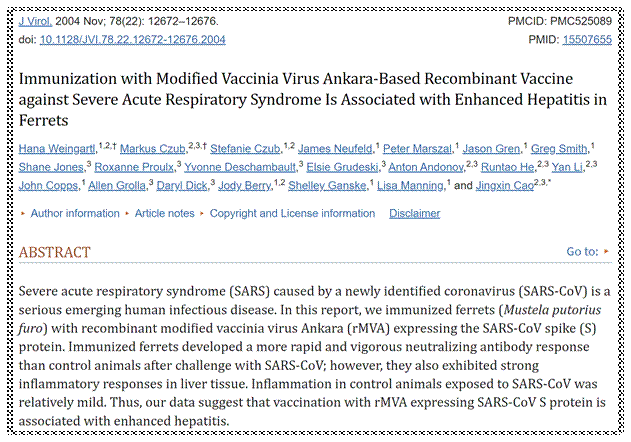 Die Autoren beziehen sich auf die Studie “Immunization with Modified Vaccinia Virus Ankara-Based Recombinant Vaccine against Severe Acute Respiratory Syndrome Is Associated with Enhanced Hepatitis in Ferrets - PMC (nih.gov)“, veröffentlicht im Jahr 2004:[2]