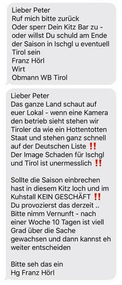 Zwei SMS von Franz Hörl, Hotelier und Bergbahnenbetreiber in Gerlos,