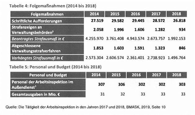 Die Arbeitsinspektion kontrolliert die Einhaltung der Vorschriften zum Arbeitsschutz vor Ort in den Betrieben und auf Baustellen. Dem Bericht „Die Tätigkeit der Arbeitsinspektion in den Jahren 2017 und 2018“ (Stand September 2019) ist folgende Tabelle zu entnehmen: