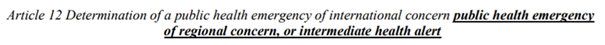 [14] Artikelweise Zusammenstellung der vorgeschlagenen Änderungen der Internationalen Gesundheitsvorschriften (2005), vorgelegt gemäß Beschluss WHA75(9) (2022) - „Artikel 12 Feststellung einer Internationalen gesundheitlichen Notlage, einer regionalen gesundheitlichen Notlage oder eines mittleren Gesundheitsalarms“ - Seite 9: deutsche Übersetzung und Originaltext: